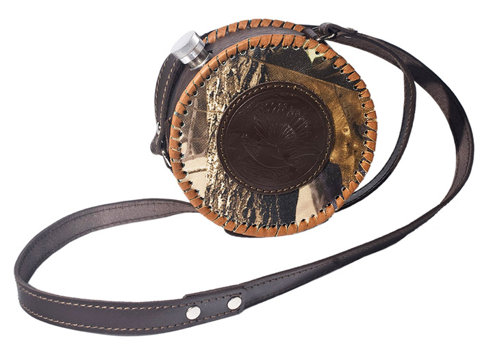 Фляжка. Нержавеющая сталь, кожаный чехол, плечевой ремень. Объем 0,6 л.