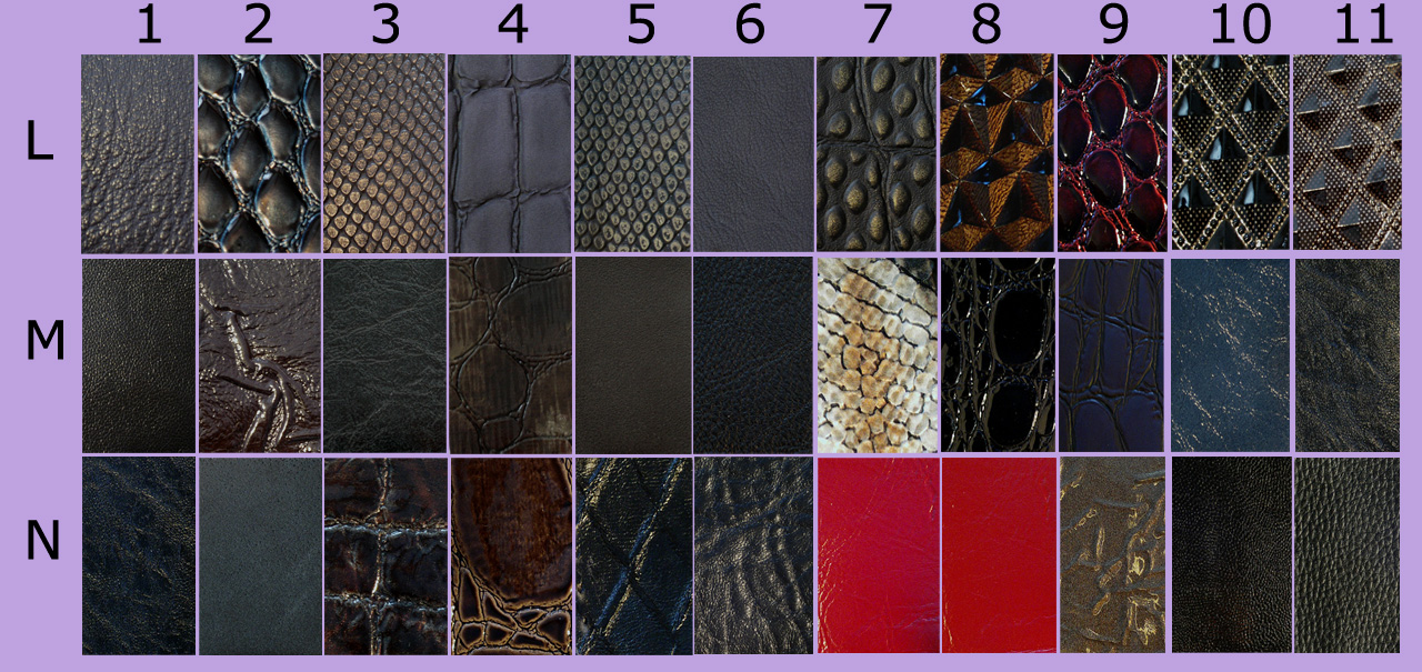Выбор искусственных кож различных оттенков и рельефа (рисунка). Для более внимательного просмотра нажимайте на картинку, она увеличится на весь экран.